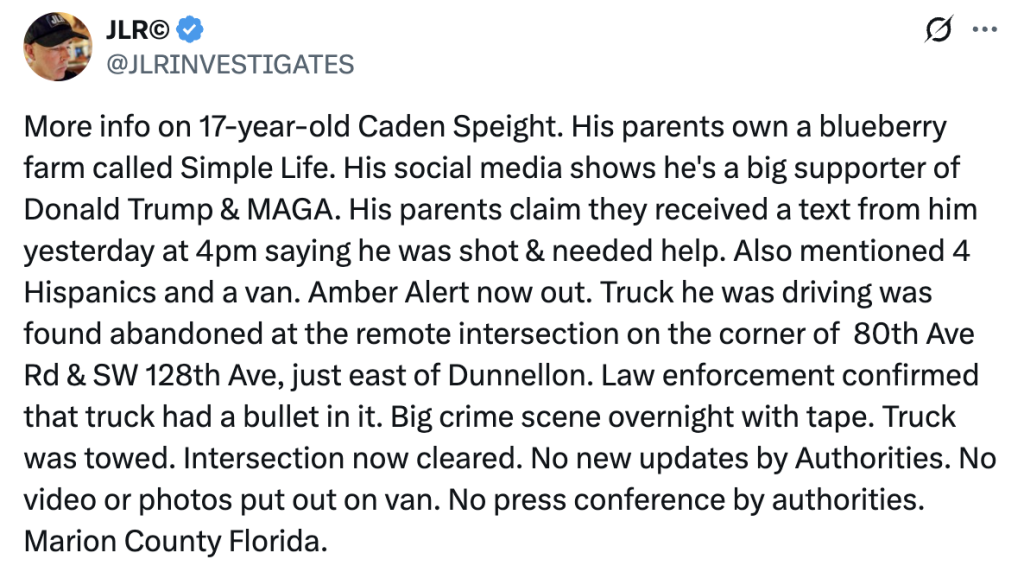 Additional reports from investigative journalists indicate Speight is a vocal supporter of Donald Trump and the MAGA movement. His parents say they received a text from him shortly after the shooting, stating that he had been shot and needed help, and mentioned four Hispanic males and a van.